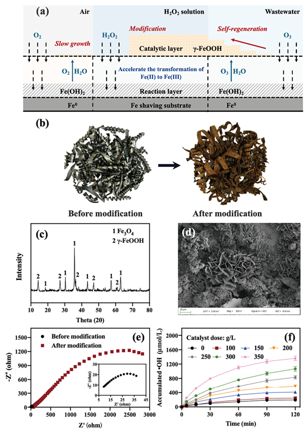 Fig. 1. (a) Modification of Fe shavings and process of surface film growth, (b) appearance of Fe-based catalyst before and after modification, (c) XRD and (d) SEM patterns of the Fe-basedcatalyst, (e) Nyquist plots of electrochemical impedance of Fe-basedcatalyst surface film before and after modification (the working electrode was a Fe shaving with an exposed area of 1 cm2, saturated calomel electrode was the reference electrode, platinum plate electrode as the counter electrode and 0.1 mol/L Na2SO4as the electrolyte solution). (f) •OH production in solution under different catalyst doses (c(TBA)=75 mmol/L, gas flow rate =300 mL/min, gaseous O3 concentration =64.4 mg/L). Copyright 2023, Elsevier Inc.