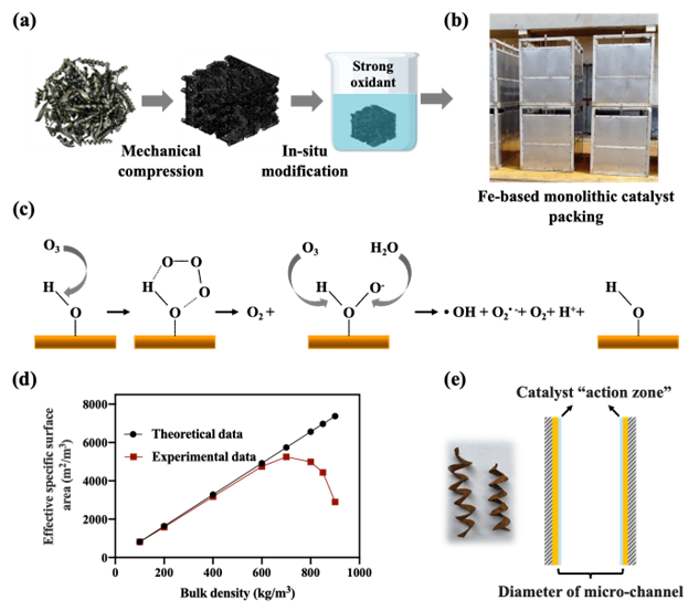 Fig. 2. (a, b) Conceptual sketch for the preparation of Fe-based monolithic catalyst packing,(c) Mechanism of •OH generation in the presence of FeOOH (Nawrocki and Kasprzyk-Hordern, 2010; Zhang and Ma, 2008), (d) The effectivespecific surface areas of Fe-based monolithic catalystpacking as a function of the bulk density, (e) Schematic diagram of “action zone” and “micro-channel” structure of Fe-based monolithic catalyst packing. Copyright 2023, Elsevier Inc.