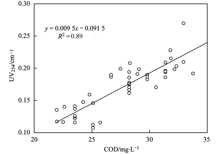 有研究表明, UV254與COD有一定的相關(guān)性, UV254值越小, 可生化性就越強(qiáng), 水中復(fù)雜有機(jī)物分解及去除效果就越好.對本實驗數(shù)據(jù)進(jìn)行COD與UV254之間離散關(guān)系分析如圖 3所示, 并得出相關(guān)系數(shù)為0.89, 說明COD與UV254之間具有強(qiáng)相關(guān)性.具體聯(lián)系污水寶或參見http://www.dowater.com更多相關(guān)技術(shù)文檔。