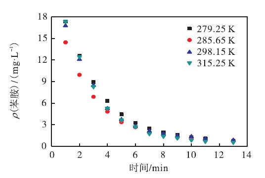 在pH=5、進水苯胺質(zhì)量濃度為26.81,mg/L、臭氧投加速率為0.92,mg/(L·min)時,設(shè)定反應溫度分別為279.25、285.65、298.15、315.25,K,考察溫度對苯胺降解的影響,結(jié)果如圖4所示.