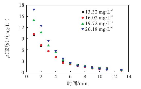 由圖5 可知:反應6,min 后,苯胺質(zhì)量濃度分別由13.32、16.02、19.72、26.18,mg/L 降為2.18、2.14、2.31、2.51,mg/L,去除率分別為83.63%,、86.64%,、88.29%,、90.41%,,苯胺的降解率隨其質(zhì)量濃度的增加而增大.反應13,min 后,上述4 種濃度降解率都能達到94%,以上.故苯胺初始質(zhì)量濃度在13.32~26.18,mg/L 時,臭氧氧化反應都可以在13,min 時使出水苯胺質(zhì)量濃度小于2,mg/L,且色度降至40.臭氧投加速率一定時,廢水中的苯胺初始質(zhì)量濃度增加,反應消耗的臭氧量隨之增加,溶液中臭氧的濃度減小,臭氧在氣液兩相間的傳質(zhì)推動力增加,臭氧傳質(zhì)量增加,從而提高了苯胺的降解率.