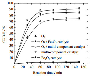 從圖 4可以看出,不同反應(yīng)體系下水樣COD的去除率增勢均在反應(yīng)時間60 min時趨于平緩,水樣COD的去除率從大到小排列為:O3/多組分催化劑 > O3/Fe2O3催化劑 > O3,分別對應(yīng)88.29%,82.60%和70.75%。與無催化劑O3氧化體系相比,O3/多組分催化劑體系和O3/Fe2O3催化劑體系對水樣COD去除率分別增加了15.87%和11.72%。