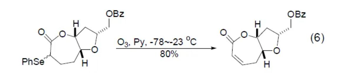 在臭氧作用下,磷化氫可以轉(zhuǎn)化為氧化膦,亞磷酸鹽可以轉(zhuǎn)化為磷酸鹽。有機(jī)硫化物在臭氧作用下可以轉(zhuǎn)化為亞砜或者砜。三級胺臭氧化可以轉(zhuǎn)化為氧化胺,而一級胺臭氧化則以適中產(chǎn)率生成硝基化合物。硒化物在臭氧作用下轉(zhuǎn)化為硒氧化物,此反應(yīng)經(jīng)常用于制備不飽和羰基化合物 (式6)[7]。