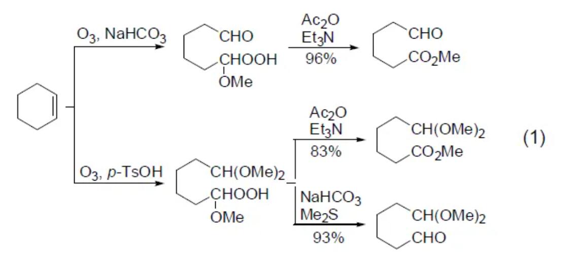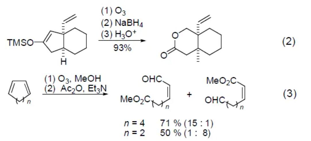 臭氧廣泛的用途是進(jìn)行碳碳雙鍵的氧化斷裂,根據(jù)后處理條件的不同可生成羰基化合物或醇。這些反應(yīng)一般是在低溫(–25~–78 oC)下,混合于空氣或者氧氣中的臭氧氣流通過底物在惰性溶劑中進(jìn)行的。常用的溶劑是CH2Cl2和MeOH,或者是二者的混合溶劑。很多烯烴都能進(jìn)行臭氧化反應(yīng),給電子基團(tuán)取代的雙鍵比吸電子基團(tuán)取代的雙鍵反應(yīng)更快。還原的后處理過程生成醛、酮或者醇。用LiAlH4或NaBH4后處理可以全部還原為醇。氧化的后處理過程把過酸的臭氧分解產(chǎn)物轉(zhuǎn)化為酮或者羧酸[1]。用該方法可以從環(huán)烯出發(fā)制備許多產(chǎn)物 (式1)[2]。
