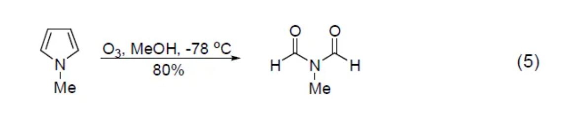 芳香化合物對臭氧的反應(yīng)性比烯烴和炔烴弱。雜環(huán)體系的臭氧分解反應(yīng)主要包括從喹啉合成吡啶衍生物,臭氧分解咪吡咯得到N-乙酰氨基化合物 (式5)[6],臭氧分解呋喃體系釋放出潛在的羧酸官能團(tuán)等。