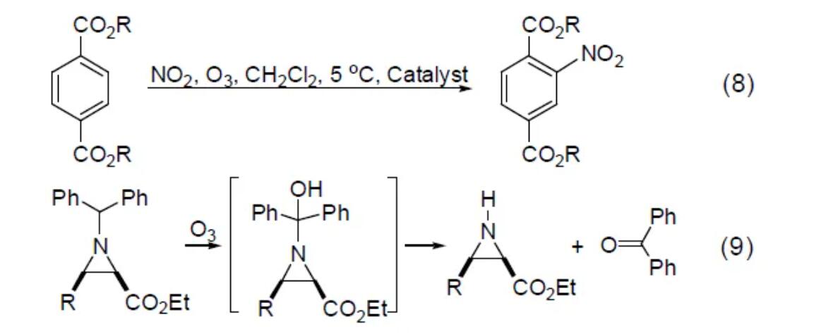 醛可以通過在乙酸甲酯或乙酸乙酯中臭氧化轉(zhuǎn)化為過酸,或者在10% 的KOH甲醇溶液中臭氧化得到甲酯。在催化劑量的Fe3+存在下,在臭氧作用下,NO2可以直接將苯二甲酸酯硝化 (式8)[9]。臭氧還可以氧化氮雜環(huán)丙基酯上的N-二苯甲基保護(hù)基團(tuán),得到脫保護(hù)的氧化氮雜環(huán)丙基酯和二苯甲酮 (式9)[10]。